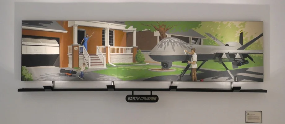 Mesurant 120 "x 36" x 14 ","Loading the UAV" est parfaitement à l'échelle d'un panneau publicitaire routier. Installé dans le Salon National de HEC Montréal, il est construit en acier, bois, fil de fer, lumières, émail et acrylique. Inspiré d'éléments de publicité et de propagande de la guerre froide, la pièce pose une réflexion humoristique sur l'état actuel du Rêve Américain.